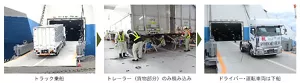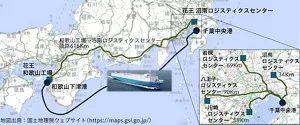 本取り組みでは、和歌山工場から約1kmの和歌山下津港において、製品を積載したトレーラーを愛媛県の大王海運が運行するRORO船*1 に積み込み、ドライバーは運転車両を切り離して下船、トレーラーのみ千葉中央港へ海上輸送します。千葉中央港に到着後は別のトラックドライバーが運転車両をトレーラーに連結して、沼南(千葉県)、岩槻(埼玉県)、八王子(東京都)、川崎(神奈川県)の各物流拠点へ輸送します。