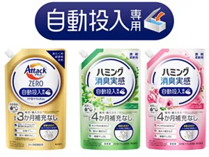 衣料用洗剤の自動投入専用商品として花王初となる「アタック ZERO 自動投入専用」は、4倍濃縮*3 を実現し、投入タンクへの補充が最長3か月不要*4 です。また「ハミング消臭実感 自動投入専用」も、1回の洗たくに必要な使用量が1/2*5 で済む専用の濃縮処方で、投入タンクへの補充が最長4か月不要*6 です。