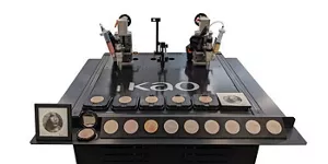 interpack 2023では、B&R社のブースに花王の加飾成形機を展示しました。デザインのベースとなる化粧用コンパクトをセットしたシャトルを浮上させ、1つずつ高精度に移動・回転・傾斜させて、ノズルからファンデーション成分を吐出してデザインを制作します。自由度の高い6次元のモーションコントロール技術と、精密な射出技術の組み合わせにより、一つひとつ異なる作品を仕上げることが可能です。