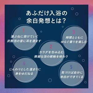 情報過多な現代だからこそ、“なにもしない、を、あえてやる”「余白時間」を入浴時に求めている若年層の実態に着目。同商品は、約10分間継続する炭酸泡の音や心地よい香りといった、ゆったりとした感覚に身をゆだねることで、ノイズとなる様々な情報をシャットアウトする“没入入浴”を促します。これにより生まれた「余白時間」によって、自身からあふれだすアイディア等に喜びを感じてもらうという、新しい入浴体験を提案いたします。