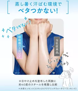 UVカット成分を閉じ込めたアクアカプセル(寒天ゲル)を含んだ剤に湿度応答剤を加え、スフレ状のクリームのような新感触のテクスチャーを実現。ふわっとした剤を肌になじませるとみずみずしく広がり、肌に溶け込むように心地よくフィットします。肌にフィットした塗膜(呼吸感ベール)は、まるで肌が呼吸するかのように軽く、日中、湿度に応じて塗膜の厚みが変化します。蒸し暑く汗ばむ外などの環境では、塗膜中の湿度応答剤が汗を吸収し肌表面がベタつくのを防ぎます。一方、エアコンがきいた室内などドライな環境では水分を放出する湿度応答剤を含む塗膜が肌の乾燥を防ぎ、日中、快適な肌感で過ごすことができます。