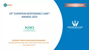 レスポンシブル・ケアは、化学品製造・管理において法令順守を超え、「人と環境を守る」「資源を効率的に使う」「透明性を高める」「ステークホルダーと対話する」といった責任ある行動を推進する国際的な自主イニシアティブです。「European Responsible Care® Awards」は、花王が所属する欧州化学工業連盟が主催しており、こうした取り組みを表彰・促進することで、業界内およびバリューチェーン全体でのベストプラクティスを共有し、化学産業全体における安全・環境・持続可能性の向上に寄与することを目的としています。