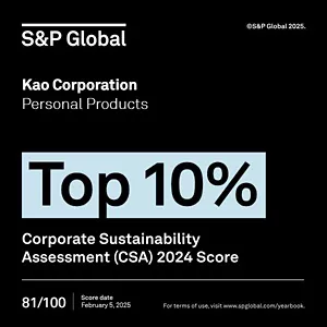 S&Pグローバル社は、毎年、環境、社会、ガバナンス(ESG)面の重要な因子から企業活動を分析し、その結果概要を年次報告書(サステナビリティ・イヤーブック)で発表しています。このたび発表された2025年版の格付けでは、評価対象の7,690社のうち、65社が「トップ1%」、75社が「トップ5%」、99社が「トップ10%」に認定され、花王は、「トップ10%」に選定されました。