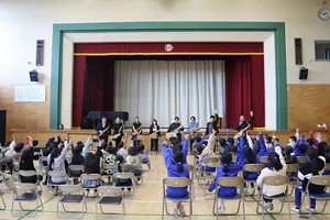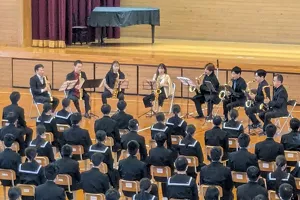 公演前日には、サクサコールが西条市立小松中学校を訪問し、体育館でミニコンサートを実施しました。迫力ある演奏に、生徒の皆さんからは「とても感動し心を動かされました」「心地よく、最後まで聴き入ってしまいました」「もっと多くの、ほかの演奏も聴いてみたいと思いました」などの感想が寄せられました。