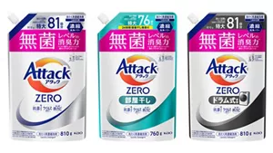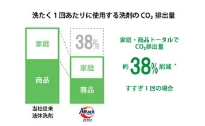 「アタックZERO」は、少ない量でも高い洗浄力を持ち、すすぎが1回ですむ超濃縮タイプの衣料用液体洗剤です。洗たく機の種類によっても違いますが、洗剤をつくる過程と、すすぎ1回のお洗たくの過程とで、CO2の排出量を従来の衣料用液体洗剤と比べて約38%削減できることがわかっています。*2