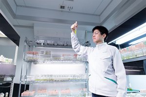 現在、世界の多くの研究機関が、藻類に着目しています。花王の生物科学研究所では、30万種以上もあると言われる微細藻類の中から、まず性質の異なる約1,200種を選抜し、一つひとつ分析を重ねてきました。これまでの研究の結果、それらの中から洗剤などの原料である、パーム核油に似た油をつくり出す藻類や、油脂を多く生産する藻類を見出しました。さらに、そこから効果的に油脂を取り出すための方法も開発されつつあります。藻類からとれた油から石鹸やシャンプーがつくられ、世界中で使われる・・・。そんな将来を見据えた研究が進んでいます。