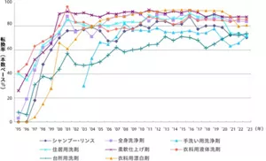 つめかえ用製品の比率は1997年から急速に増え、現在では約80%強で推移しています(本数ベース)。たとえば柔軟仕上剤のつめかえ用の比率は約90%で推移しています。つめかえ・つけかえ用製品によるプラスチック削減量は78.3千トンにのぼります(全品が本品容器である場合との比較。花王(株)2023年実績)。