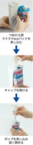 | ・ボトルへのつめかえ作業がいらない、専用ホルダーです。作業時間は約10秒※ です。 ※平均的な作業時間 ・(つめかえ用)ラクラクecoパックをつけかえられます。 ・独自開発のポンプで最後まで無駄なく使いきれます。 ・プラスチックの使用量が少なく、環境にやさしいホルダーです。 |