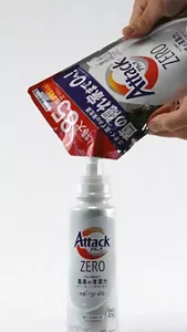 | ・住居用洗剤など、スプレーつきボトル用のつめかえ用パックです。 ・ボトルの口にパックの注ぎ口を掛けられる、フックがついています。 ・液体が流路に沿って流れやすいように、注ぎ口にエンボス(凹凸の型押し)加工がされています。 |