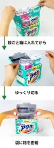 | ・粉末用の袋ごと箱につめかえるタイプです。 ・粉が飛び散らないように、袋ごと箱に入れてから開封できるようになっています。また、はさみを使わず、手でかんたんに切れます。 ・スプーンですくいやすいように、袋を開封すると袋が箱に密着するようになっています。 |