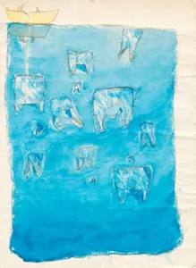 絵の下側を見ると、海底の冷ややかさを感じ視線を上げたくなる。光の扱い方が見事で、静かなのに動きのある作品だ。浮いているのがビニール袋だとわかった途端、生物の存在が皆無なことに気づき、寂しさ、恐怖を覚えた。しかし、海面に浮かぶボートを発見するとほっとし、「私たちにできることがまだあるはずだ」という期待が感じられた。ビニール袋は溶けた氷河の塊にも見える。自分の行動が環境に与える影響の大きさを、間接的に訴えているのではないだろうか。