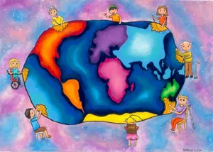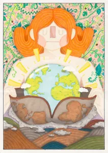 地球は不完全な場所です。大気汚染、森林伐採、野生動物の絶滅など問題が山積みです。それでもなお、地球はたくさんある惑星や星の中で唯一私たちが生きている場所なのです。私の絵には、子どもや老人、障がいのある人など、生い立ちや能力の異なるいろいろな国の人々が力を合わせて地球の傷を縫い合わせ、元の姿に戻そうとしている様子が描かれています。今こそ、将来の世代のために、唯一無二の地球の再生にみんなで取り組むときです。