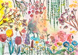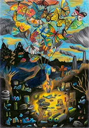 美しくも、枯れたような色合いの花々。その中の蝶のような虫も元気がないように見える。自然環境は人間だけのものではないことを訴えている。子どもが虫の身になって感じ、考える感受性を持っていることに救いを感じる。