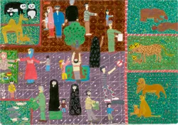 中央に描かれた自然を象徴する木々に、たくさんの動物と人間が向かっていっている。前に向かって歩いて行こうという力強さを感じた。色と構図も非常にインパクトがあり、目を惹く作品だ。