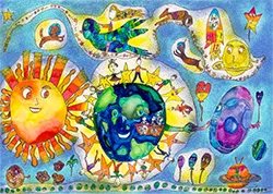 宇宙の成り立ちから環境に関することまでを、一つの絵の中にまるでおとぎ話のような世界観で描いた楽しい作品。見えている世界が大人とは全く違う子どもならではの視点を失わないで欲しい。