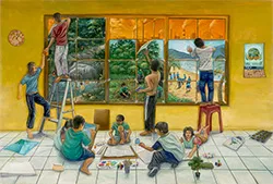 若者のグループが役割分担をして共同作業をしています。大きな窓の外の景色を変えているのがはっきりとわかります。工場で汚染された風景を、望ましい自然あふれる未来が描かれたシートに張り替えています。近代的な道具は何一つ使っていません。「お互いに協力して自分たちの地域社会の問題を解決したい」という力強く、熱意あるメッセージが伝わってきます。