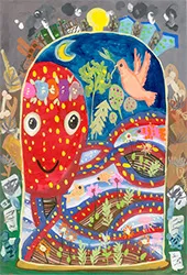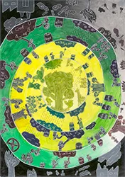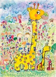 「地球は丸い」という固定観念を持たず、自由な形で地球を描いているのが、子どもならではのユニークな視点だ。毎年、地球をモチーフにした作品が数多く応募されるが、子どもたち一人ひとりのバックグラウンドや時代背景は全く異なっている。本作品は、老若男女、さまざまな人種の人たちが協力しながら、地球を繕って、必死に丸くしようとしている描写が非常に今年らしい。世界はつながっているのだというメッセージもよく伝わってくる。