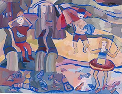 独特の色合いが非常に印象的な作品。二人の子どもは水辺で楽しく遊んでいるが、一人は汚染源を見て驚愕している。同じ現実を生きる中で、気づくことと気づかないことの怖さが表現されている。