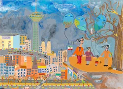 工場の煙をバックに、防毒マスクをつけた家族が描かれている。今の状況を子どもの視点で端的に表している作品だが、一方で描かれた三つの風船と全体的に明るい色合いが、未来への希望も感じさせる。
