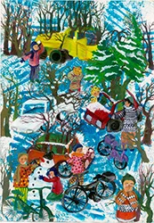自然の象徴として「雪」を描いている。朽ちた車の中から生えている木が、何かしらのメッセージを投げかけているようだ。見る人によってさまざまな受け取り方ができるユニークな作品である。