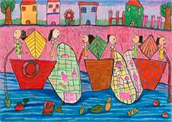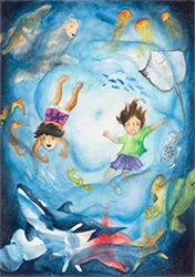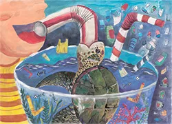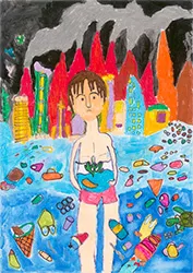海岸や川のプラスチックごみを、網ですくっている人々を描いている。このテーマは、各国・各地域から多くの応募があったが、中でも特に印象的な作品だ。解決へ向けた活動の必要性に改めて気づかされた。
