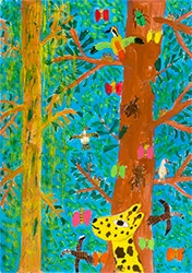 思いつく限りの生命を一枚の画用紙の中に描いた、非常にエネルギッシュな作品。子どもたちは、地球上に生きるさまざまな動物の存在を意識し、人間もその一部だと気づいているのだろう。