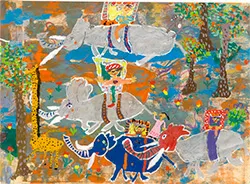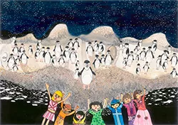 「世界をこんな風に楽しく美しくしていきたい」という子どもたちの願いが、素直にのびのびと表現されている。背景に描かれた自然の色彩感覚と、大人には思いつかないような象の配色も見事だ。
