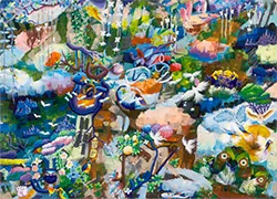 大胆な構成でありながら、色が混ざって濁ることのないよう注意深く描かれている。未来や調和のとれた世界を想像して、濁りのない鮮やかなイメージを描いたのではないだろうか。大いに共感できる。
