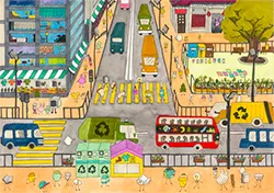 ごみだらけになった街を、こんなに楽しく描いた絵は本作だけではないだろうか。街には人間が一人もおらず、ごみだけが歩き回っている。現代の問題を独特に皮肉った、非常にユニークな作品だ。