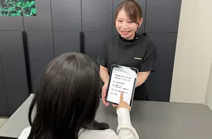 指差しシートを使って化粧品のカウンセリングをしている様子