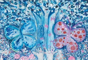 それぞれの蝶の羽をよく見ると、魚や花が描かれており、まるで自然のいのちひとつひとつを全て蝶の中で表現しているようだ。人間の手の中で潰れてしまうほどか弱い存在の蝶を大事にし、自然を守ることで空を舞うことができるのだということを、シンボリックに伝えている点がすばらしい。
