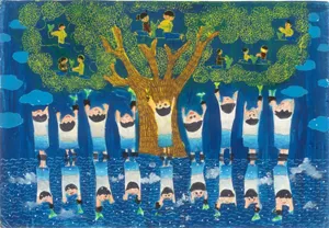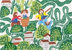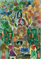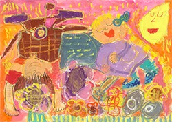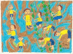 一目で、みんなで植樹している様子を描いていることがわかる。これらの木々が成長した未来像を子どもたちが分かち合い、草の上に広がる木の形や影として描かれているのが興味深い。長い年月を通して、こうした樹木との関わりがしっかりと生活に根づいていることを教えてくれる作品だ。