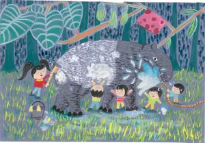 子どもたちがバクを洗っている姿が、自然の中での人と生きものの共生を表現している。このワンシーンを見ていると、前後の物語が思い起こされ、動物と子どもたちの関わりが想像される。一緒にこの絵を見ながら話をしたら、子どもたちと会話が広がると感じられる、楽しい作品だ。