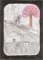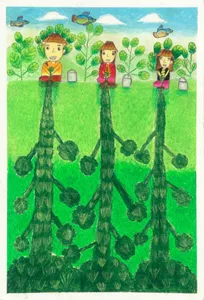 遠足でヴァイタルナ川に行き、森や自然を育てるために植物を植えたという、本人の経験から描いた作品。環境課題に対する子どもたちの責任感が、強いメッセージとして込められている。木と水が混ざりあってひとつになっているところも奥深い。