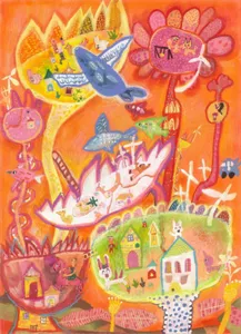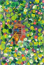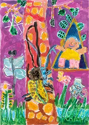 作者が空想した魔法の木を描いているが、まるで実在するかのようにいきいきとしている。輪郭線を白くしたり、葉っぱもスポンジで色づけしていたりと、見れば見るほど味わいのある作品。