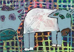 二人の人間が布をかぶって牛に変装しているようにも見える不思議な作品。背景も檻を連想させ、困惑したような表情からも決してハッピーではない状況ととらえられる。牛と人間との関係など、この謎めいた絵に関する解釈は見る人に委ねられているようだ。
