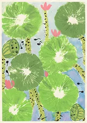 使用している色は少ないながらも葉の色は緑の濃淡のみで変化をつけ、寒色系の背景にピンク色をポイントとしてあしらっている。後ろでオタマジャクシが泳いでいたり、水の色も変化したりと、リズム感があり描写力のある作品だ。