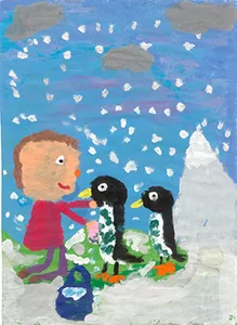 温暖化によって南極の氷が溶けて、ペンギンの居場所が少なくなっている環境問題について描かれた作品。涙を流しているペンギンをねぎらっているようで、やさしく生きていこうというメッセージを受け取り、心を打たれた。