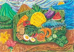 野菜や魚は自然の恵みであり、それはプラスチックではなく自然のもので包装するべきだと、プラスチック削減をストレートに表現。個々の食材が美味しそうに描かれ、作品全体も非常に力強いタッチで描かれている。