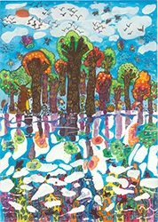 ひとつの絵ではあるが、いくつかの絵が作品の中にまとめられているような作品。モノクロにもかかわらず、作者の、自然の豊かさを描き出している細かい線の使い方、ストーリー性の表現の仕方がすばらしい秀作だ。