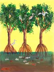 マングローブを中心にした美しい緑の世界に、鳥や魚が描かれている。めざしたい自然の姿のお手本のような作品だ。「この絵を通して私は環境をサステナブルなものにしていく手助けをしたい」という作者のメッセージにも惹かれた。