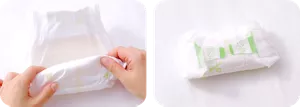 Расправьте новый подгузник, приподнимая внутренние оборочки во избежание протеканий.