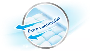 Más de 5.000 millones* de orificios invisibles en la capa respirable.Libera la humedad hacia afuera del pañal. Mantiene seco incluso después de pipí. Seco por más tiempo.